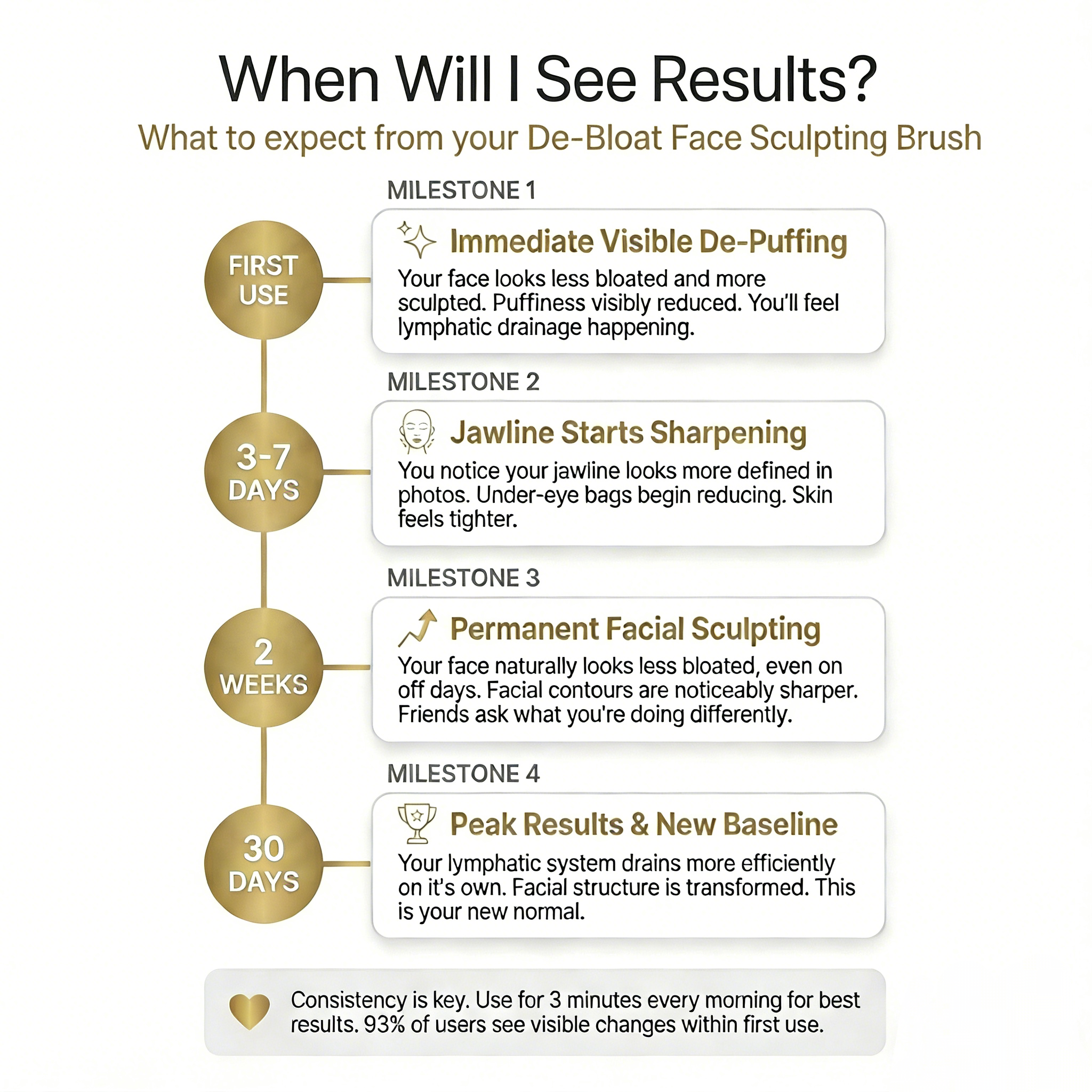 Many users feel a light draining sensation and see reduced puffiness after the first use. With consistent use, tone and definition typically improve within 1โ2 weeks.